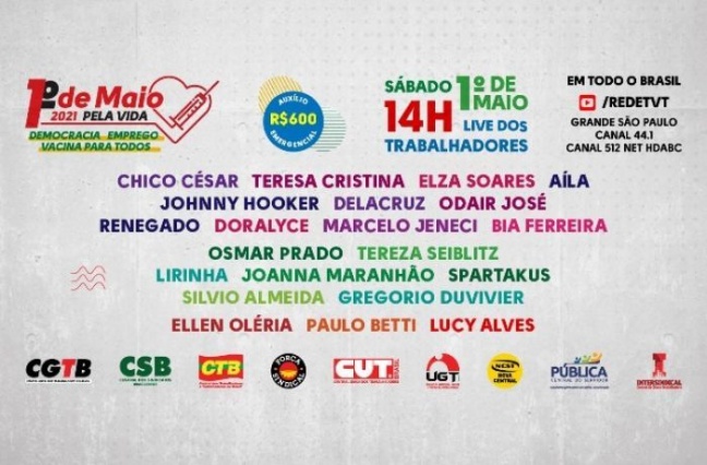 Seguem os artistas que se apresentarão no 1º de Maio Unitário das Centrais Sindicais, cantando ou com depoimentos: Elza Soares, Chico César, Tereza Cristina, Delacruz, Johnny Hooker, Marcelo Jeneci, Odair José, Aíla, Renegado, Bia Ferreira, Doralyce; Osmar Prado, Gregório Duvivier, Spartakus, Lirinha, Tereza Seibilitz, Elen Oleria, Paulo Betti, Lucy Alves, além de mensagem do acadêmico Silvio Almeida e a atleta Joana Maranhão.
