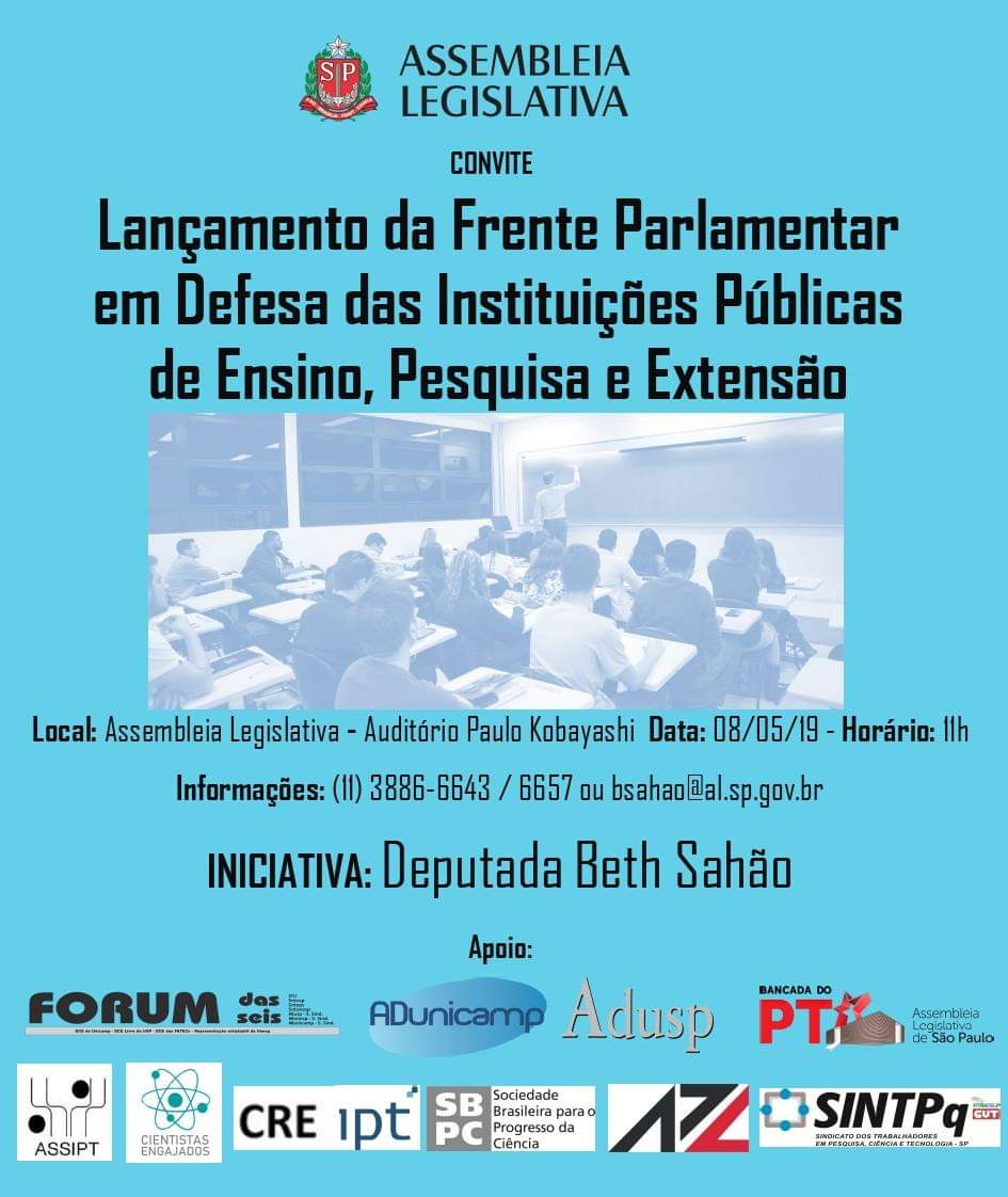 A nova frente será liderada pela deputada Bete Sahão e nasce com a fusão de duas outras, a Frente Parlamentar em Defesa dos Institutos Públicos de Pesquisa e das Fundações Públicas do Estado de São Paulo e a Frente Parlamentar em Defesa das Universidades Públicas no Estado de São Paulo, ambas lideradas anteriormente pelo ex-deputado Carlos Neder. As duas foram oficiantes unidas em evento na Alesp, no dia 13 de março (foto).