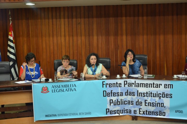 No mesmo dia, autoridades e representantes de instituições de ensino reuniram-se para discutir o futuro de universidades públicas do estado. Coordenada pela deputada Beth Sahão, a mesa contou com a participação de Priscila Leal, diretora do SINTPq.