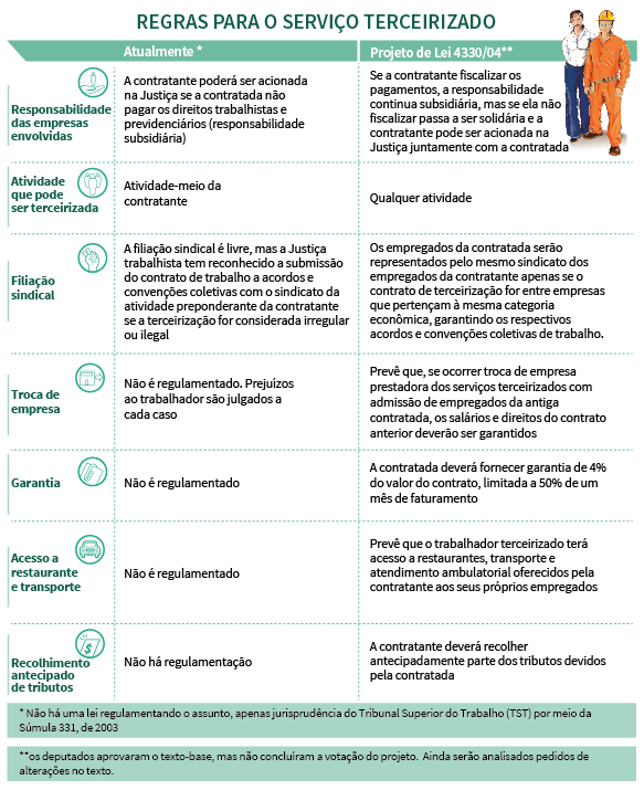 O texto não usa os termos atividade-fim ou atividade-meio, permitindo a terceirização de todos os setores de uma empresa. Os opositores do projeto argumentam que isso provocará a precarização dos direitos trabalhistas e dos salários.