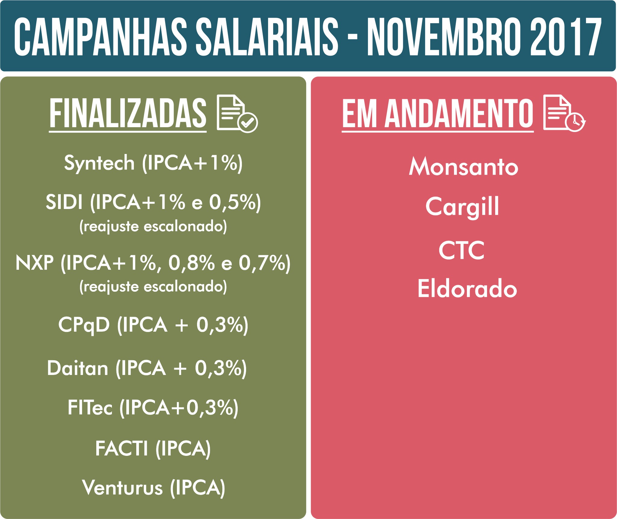 A maioria das campanhas salariais com data-base em novembro foi encerrada nas últimas semanas. Em todas elas, ganhos reais nos salários e/ou benefícios foram conquistados. Para 2018, estão previstas assembleias e reuniões negociais durante o início de janeiro, no Instituto de Pesquisas Eldorado, na Oxitec e no Centro de Tecnologia Canavieira (CTC).