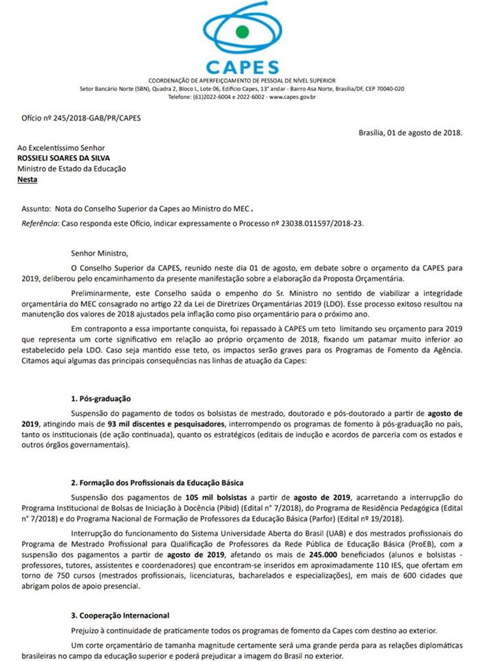 Na prática, isso pode significar a suspensão de todas as bolsas de mestrado, doutorado e pós-doutorado concedidas pela Capes, a partir de agosto de 2019. Isso deve atingir “93 mil discentes e pesquisadores, interrompendo os programas de fomento à pós-graduação no país, tanto os institucionais (de ação continuada), quanto os estratégicos (editais de indução e acordos de parceria com os estados e outros órgãos governamentais).” A Lei de Diretrizes Orçamentárias (LDO), de autoria do governo, foi aprovada em julho pelo Congresso e ainda deve passar por crivo do Supremo. O corte radical foi informado à Capes pelo Ministério da Educação (MEC).