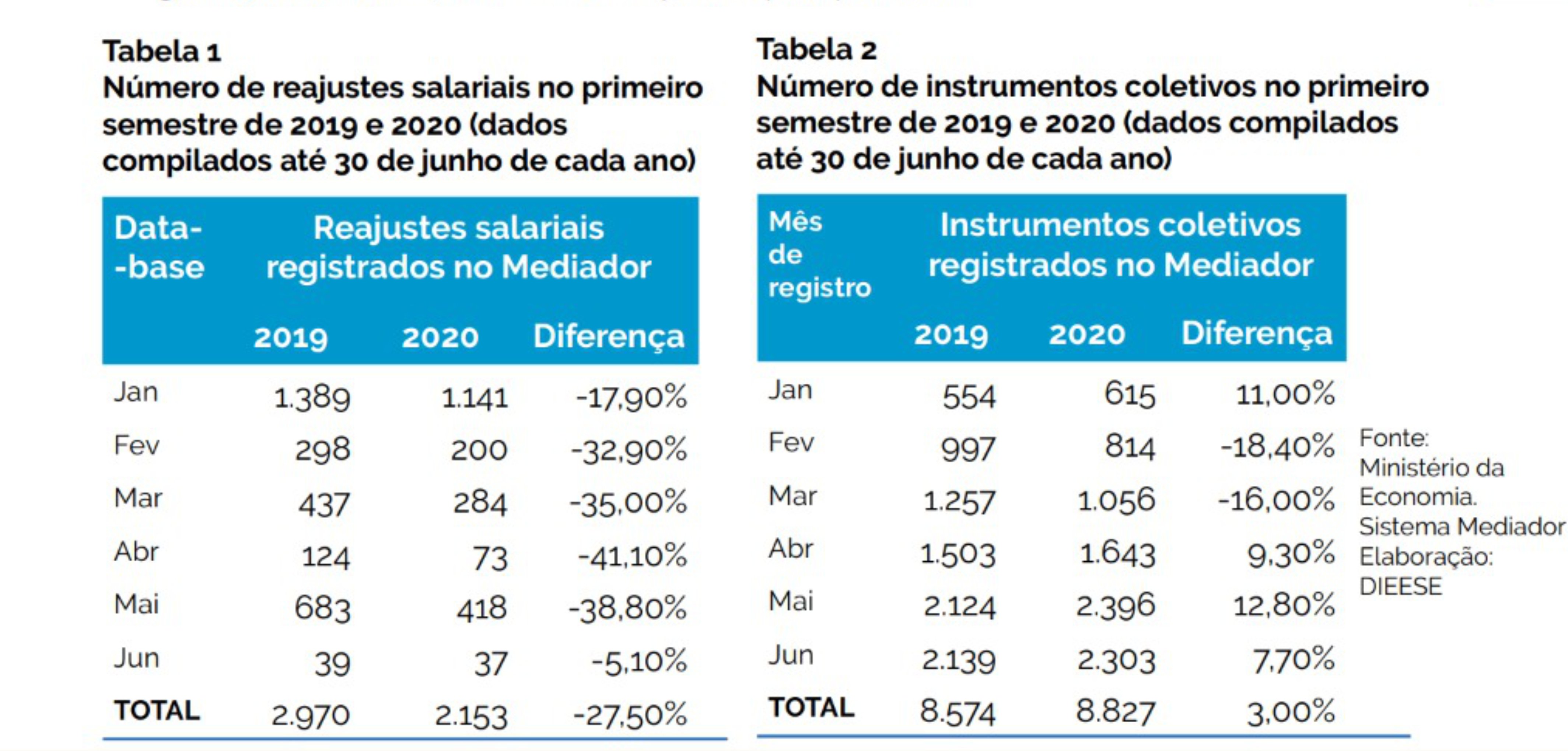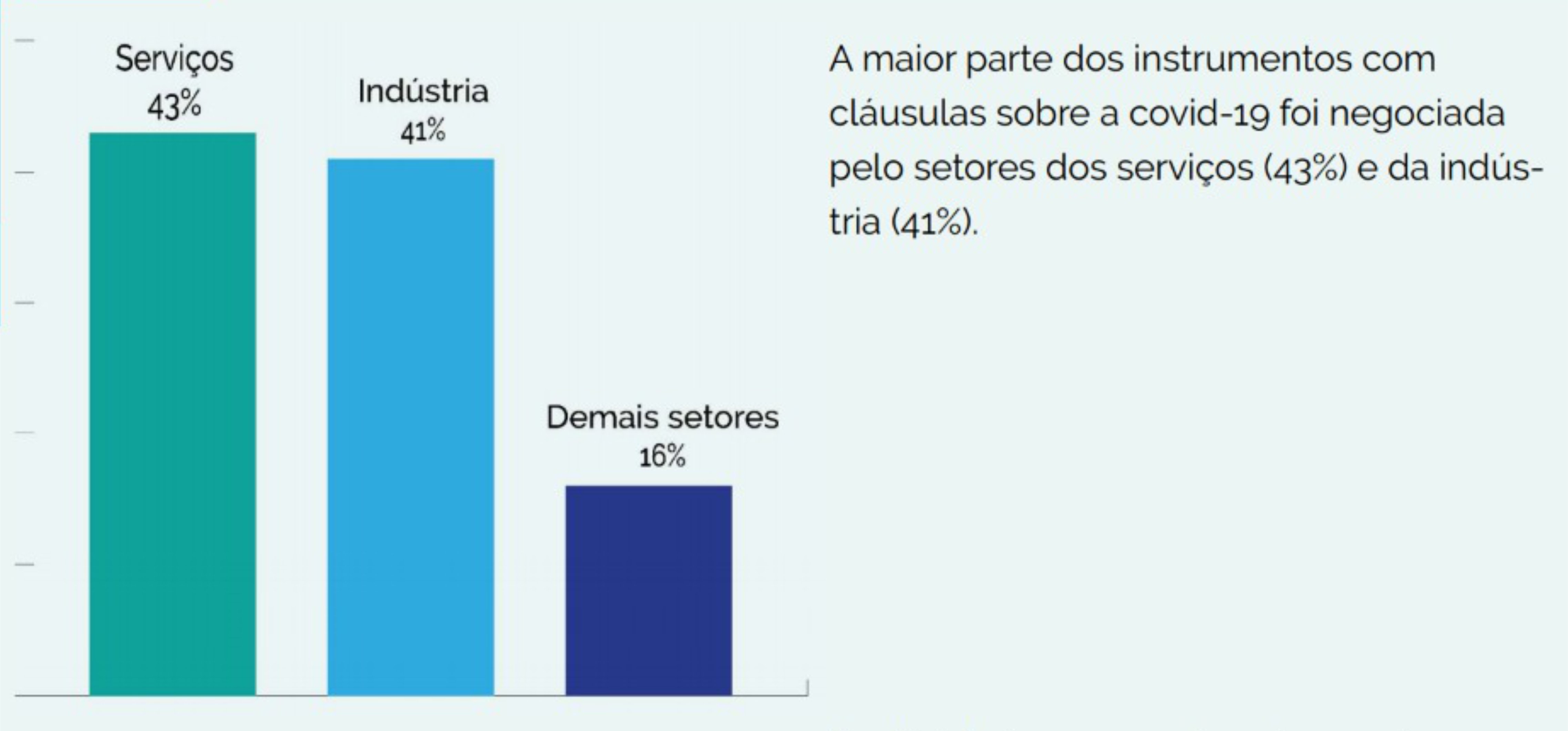 A pandemia passou a ser tratada nas negociações coletivas no Brasil em março. Desse mês até junho foram registrados 7.398 acordos e convenções. Dentre os registrados, cerca de 55% deles (4.082) possuem cláusulas relacionadas à Covid-19. Os registros foram feitos no Mediador, um sistema online do Ministério da Economia onde os sindicatos registram os acordos e convenções coletivas firmadas.