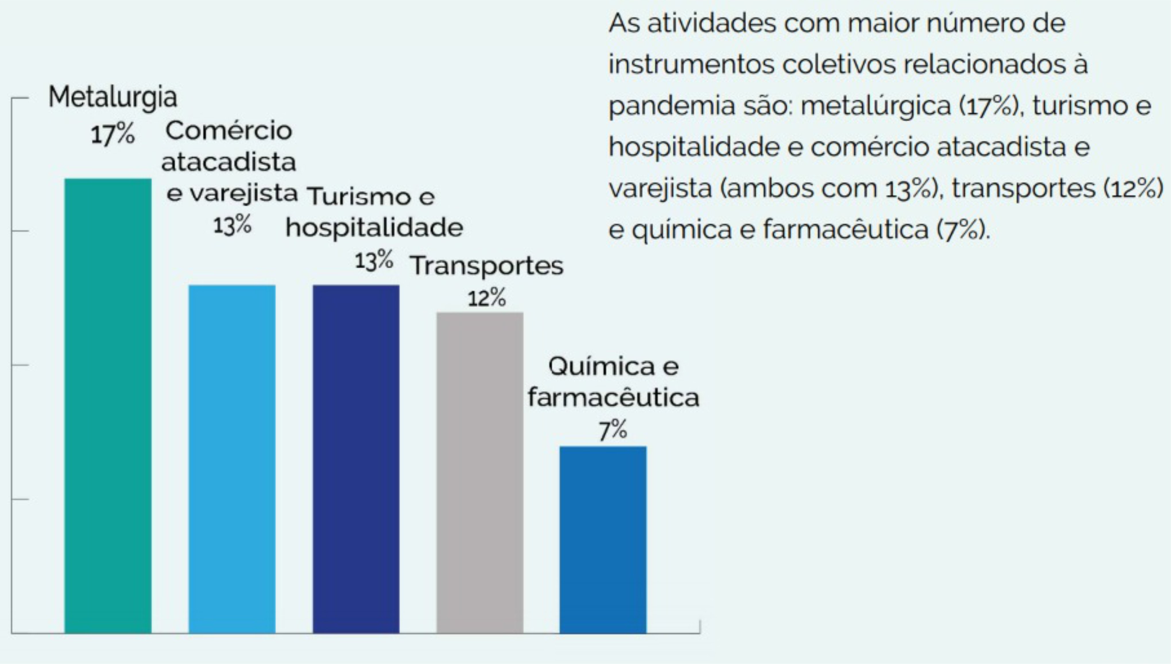 A pesquisa do DIEESE mostra ainda que a categoria que conseguiu estabelecer mais condições para as relações de trabalho durante a pandemia foi a dos metalúrgicos, com 17% das cláusulas relacionadas. Seguindo, estão os comerciários e trabalhadores da área de turismo e hotelaria, ambos com 13% das cláusulas ligadas à Covid-19. As empresas da indústria química e farmacêutica foram as que menos estabeleceram cláusulas, com apenas 7%, apesar desses trabalhadores serem de grande importância neste momento com a produção de medicamentos.