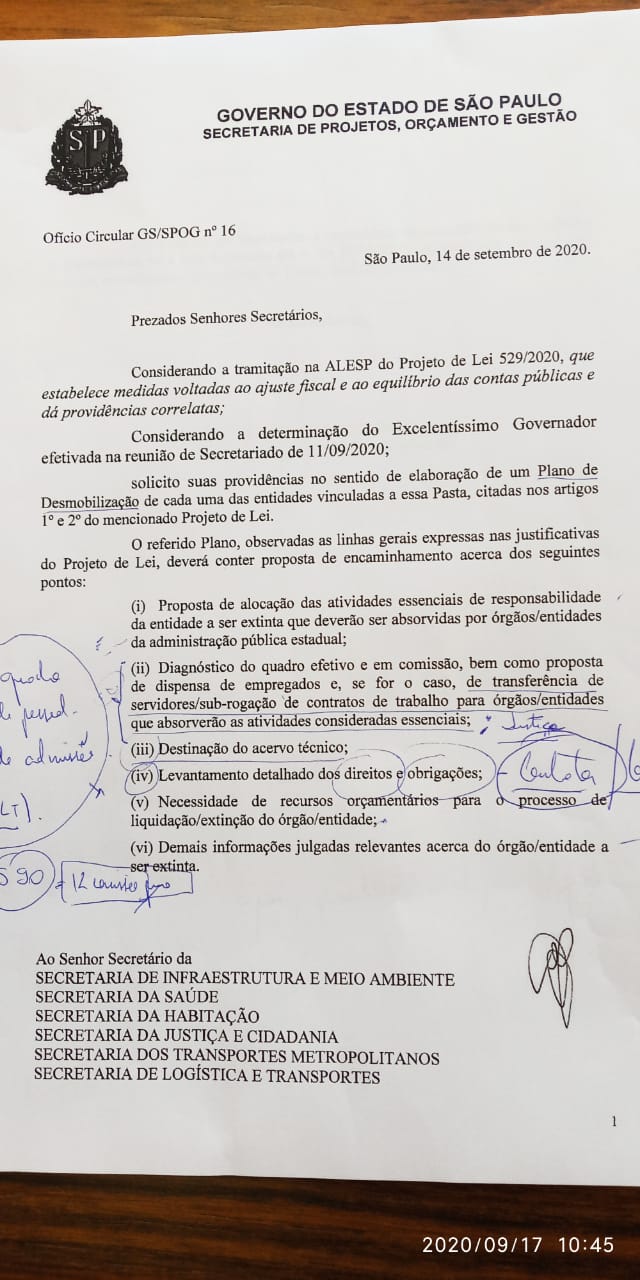 Com base no Projeto de Lei 529/2020, o governo estadual está preparando a demissão de profissionais 10 autarquias, fundações e empresas públicas. O projeto está em tramitação na Assembleia Legislativa e visa acabar com 10 instituições ligadas à pesquisa e importantes serviços governamentais.