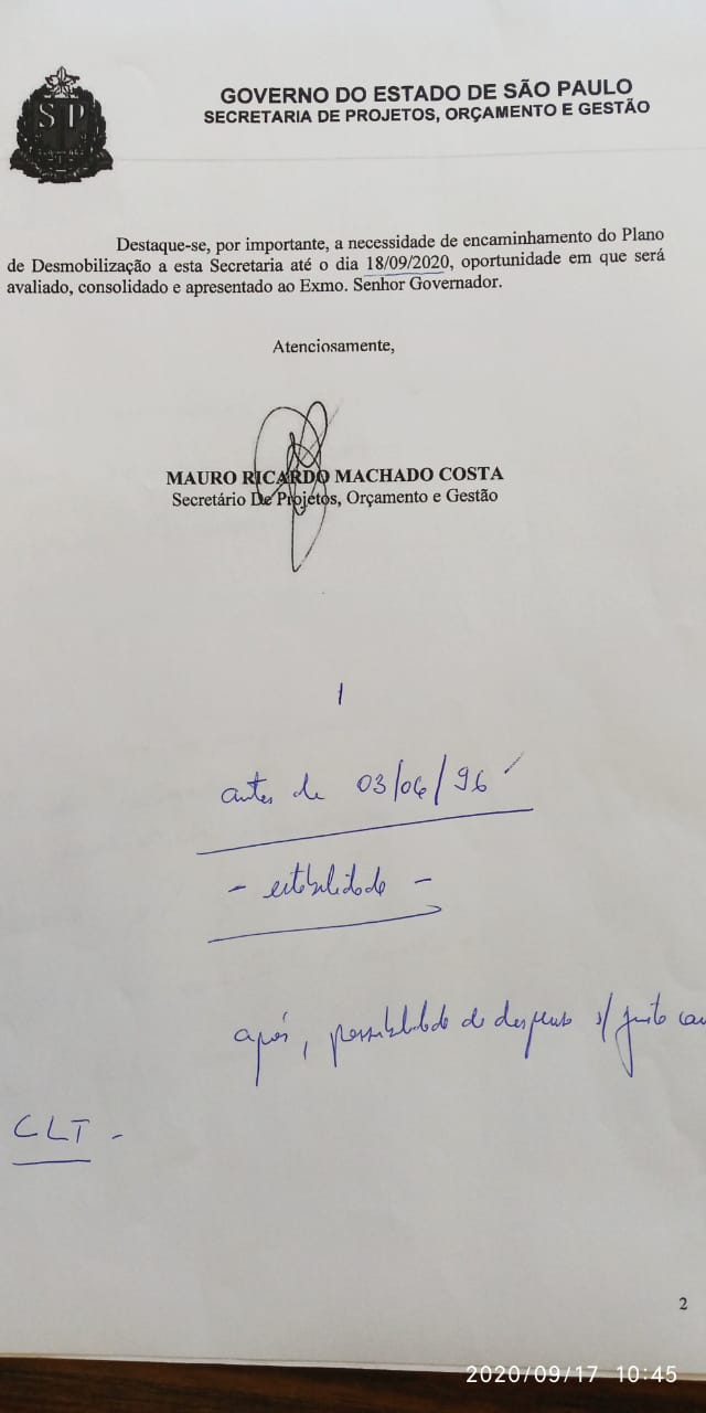 No Ofício Circular GS/SPOG n° 16, ao qual o SINTPq teve acesso, a Secretaria de Projetos, Orçamentos e Gestão indica que as demais secretarias estaduais devem fazer um diagnóstico do quadro efetivo, estudando a transferência e dispensa de profissionais. Uma anotação no documento aponta que apenas trabalhadores admitidos antes de 3 de março de 1996 terão sua estabilidade respeitada. Confira o documento abaixo e veja mais detalhes.