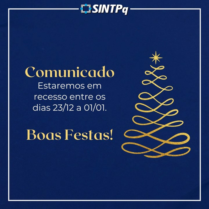 SINTPq estará em recesso entre 23/12 e 01/0122/12/2022O sindicato deseja boas festas a todos os profissionais da categoria e suas famílias