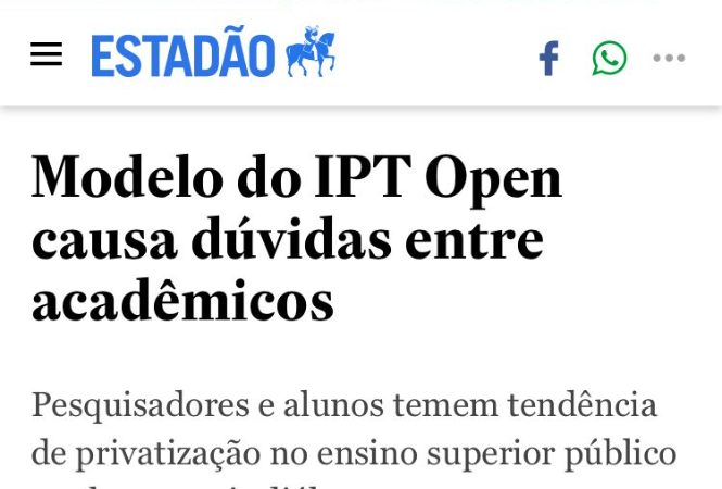 SINTPq se manifesta sobre o IPT Open em reportagem do Estadão27/09/2021A diretora do sindicato e pesquisadora do IPT, Priscila Leal, avaliou o projeto implementado no instituto em sua declaração à reportagem.