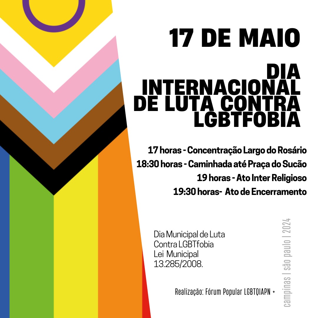 Coletivos de Campinas reunem em ato contra LGBTFobia17/05/2024O ato terá início às 17 horas, com concentração no Largo do Rosário, seguido por uma caminhada e um ato inter-religioso, encerrando por volta das 19h30