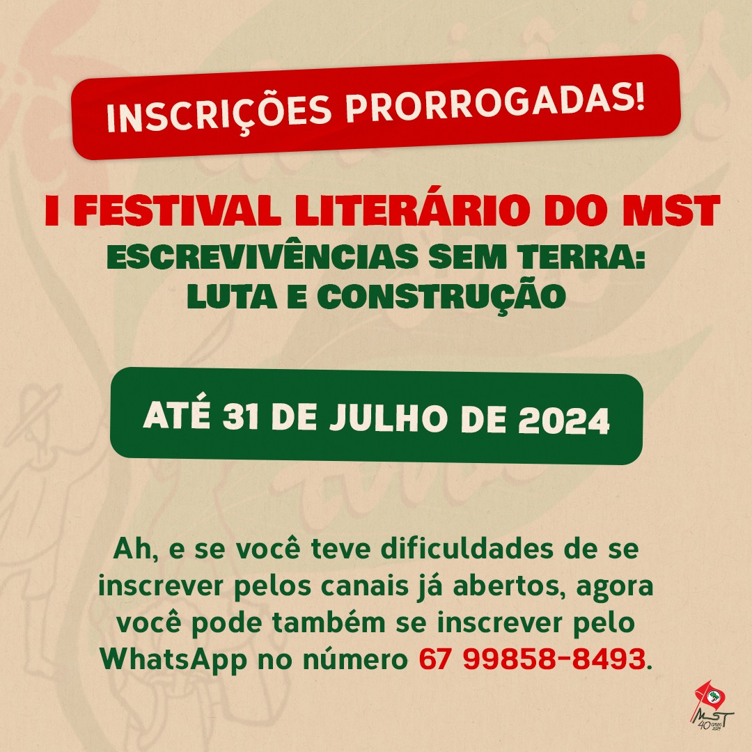 MST promove 1° festival literário para escrevivências Sem Terra14/03/2024O objetivo é trazer presente a rica e complexa trama de escrevivências Sem Terra