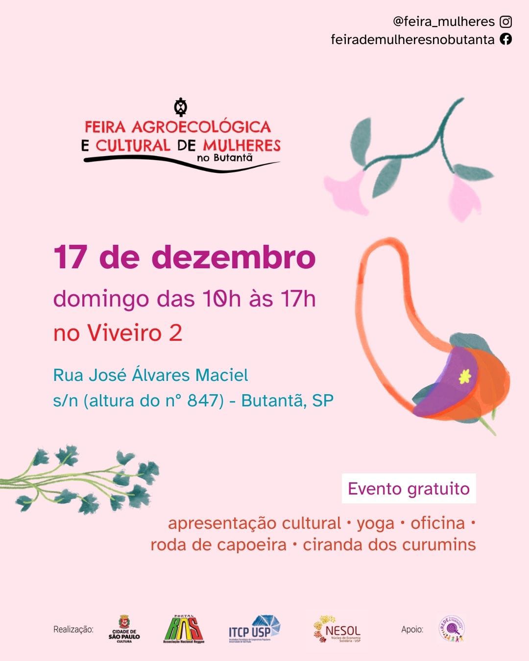 Feira agroecológica e cultural de mulheres oferece programação gratuita no Butantã15/12/2023A edição de dezembro comemora 6 anos do coletivo de mulheres talentosas, dedicadas a uma vida mais bonita, saudável e justa