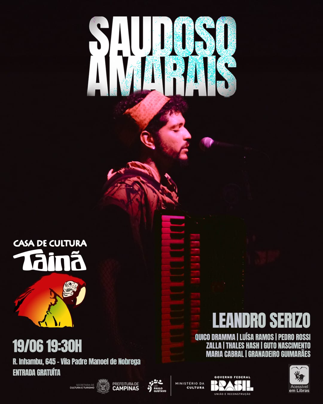 Na próxima quinta-feira, 19 de junho, às 19h30, o artista Leandro Serizo apresenta o espetáculo Saudoso Amarais na Casa de Cultura Tainã, com recursos da Lei Paulo Gustavo de Campinas. O trabalho une música, dança e performance, e parte do álbum homônimo lançado em 2023 com apoio do FICC Campinas, inspirado na vivência do artista na periferia campineira, especialmente no território dos Amarais, onde cresceu. O show de lançamento ocorreu no CEU Vila Esperança, na própria região.