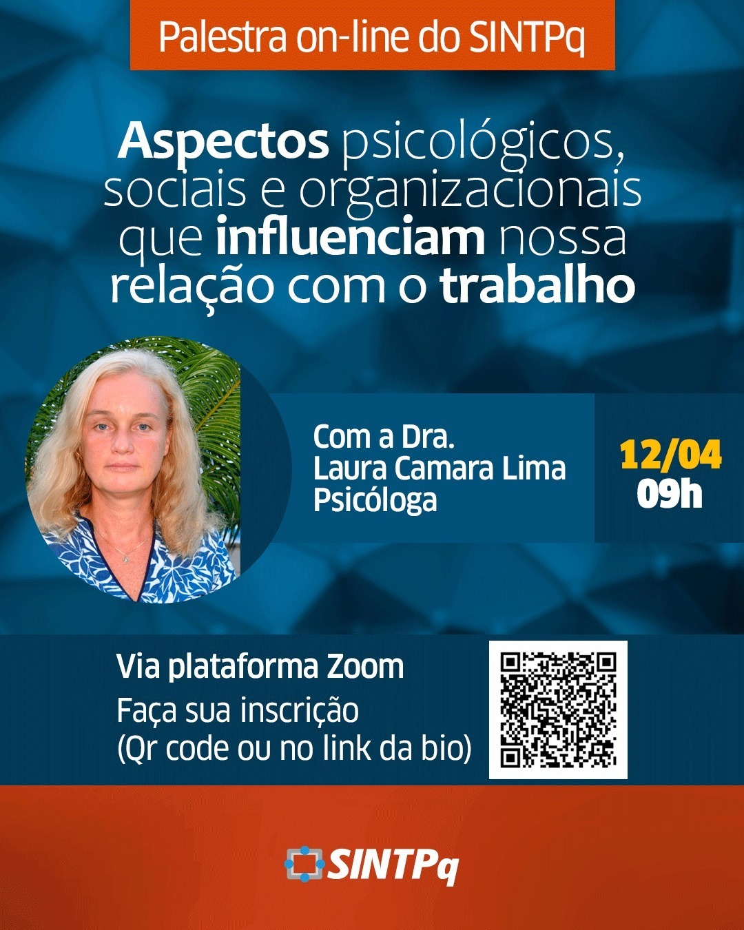 A crescente pressão por resultados, a instabilidade no emprego e a falta de valorização profissional têm afetado diretamente a saúde emocional de trabalhadores e trabalhadoras em diversas áreas. Pensando nisso, o SINTPq, em parceria com o Centro Nacional de Estudos Sindicais e do Trabalho (CES), promoverá a palestra on-line “Aspectos psicológicos, sociais e organizacionais que influenciam nossa relação com o trabalho”, com a Dra. Laura Câmara Lima.
