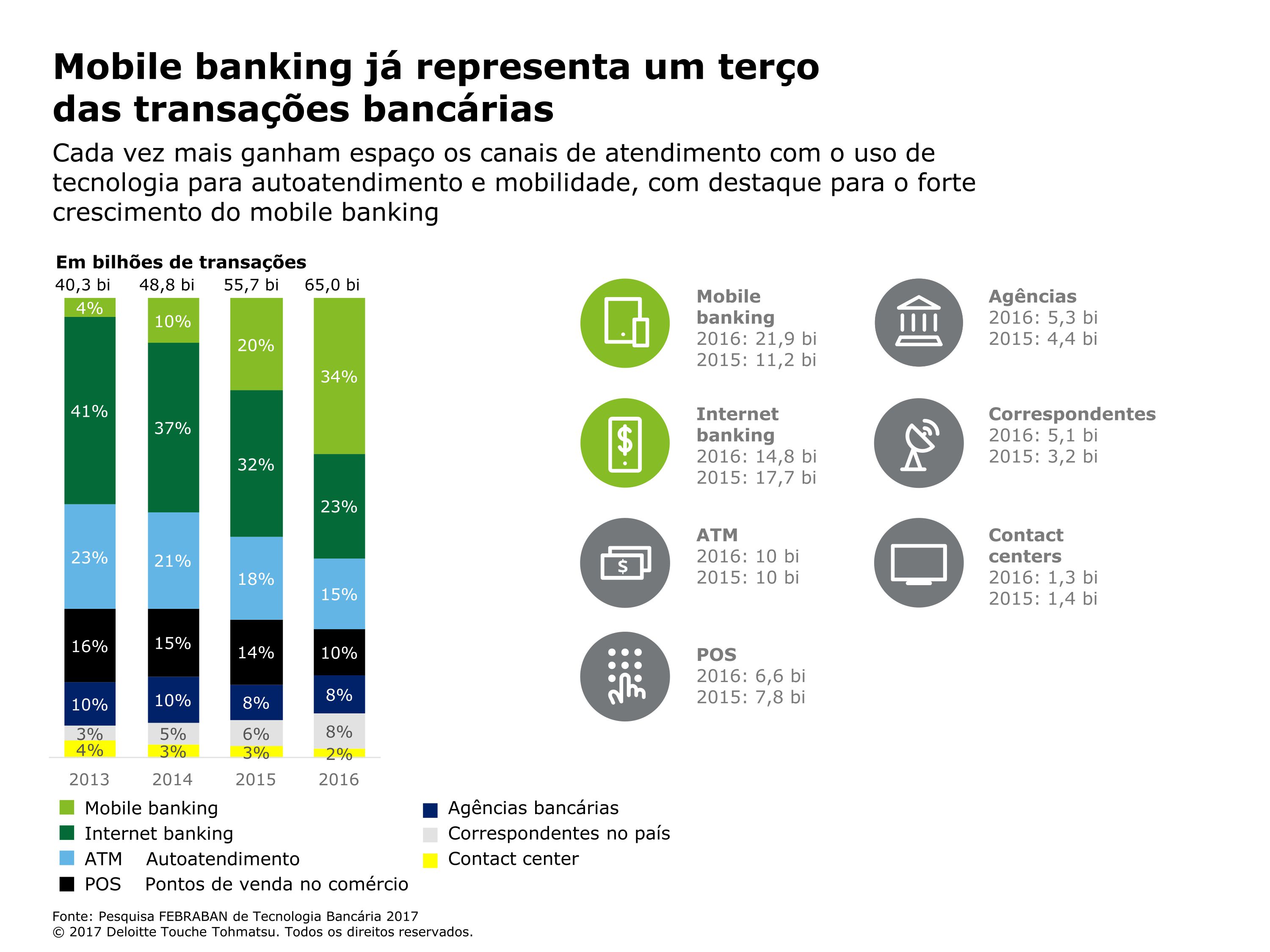 Considerando apenas as transações via mobile, o montante chega a 34% dos procedimentos realizados em todos os bancos do país no ano passado, o que equivale a 21,9 bilhões de operações. Em 2011, o total foi de 190 milhões. Essa diferença representa um crescimento de quase 11.000% no número de procedimentos com uso de celulares ou tablets.